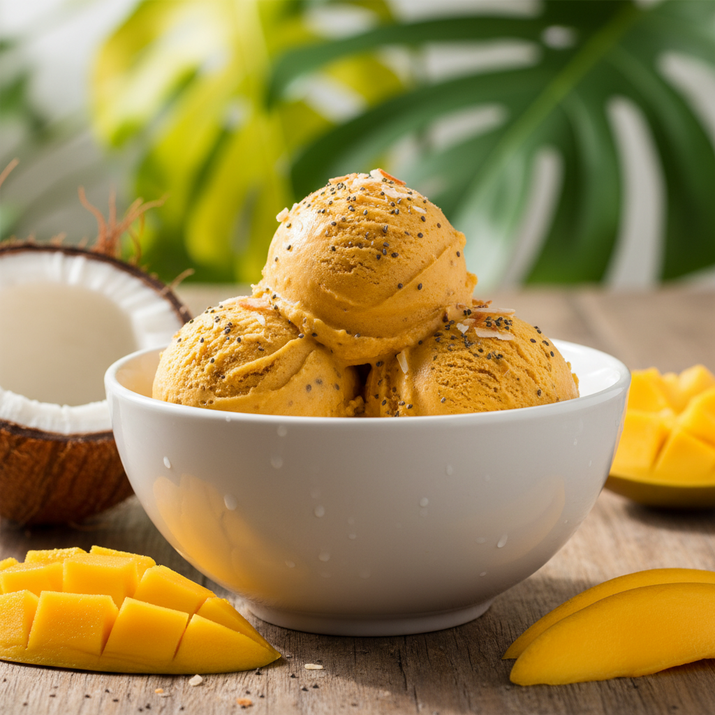 • As a Topping: Use a small scoop as a topping for a warm slice of dairy-free mango upside-down cake or a light coconut rice pudding.