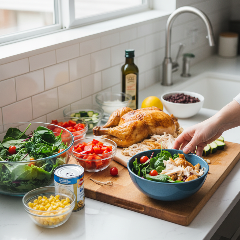 - Protein: Canned tuna/chicken, eggs, Greek yogurt, beans, lentils, rotisserie chicken, pre-cooked shrimp.