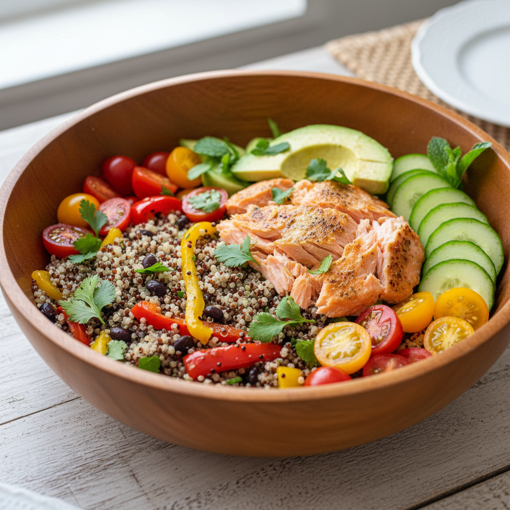 - Lunch: Quinoa salad with baked chicken, cucumber, bell peppers, and a lemon-olive oil dressing.