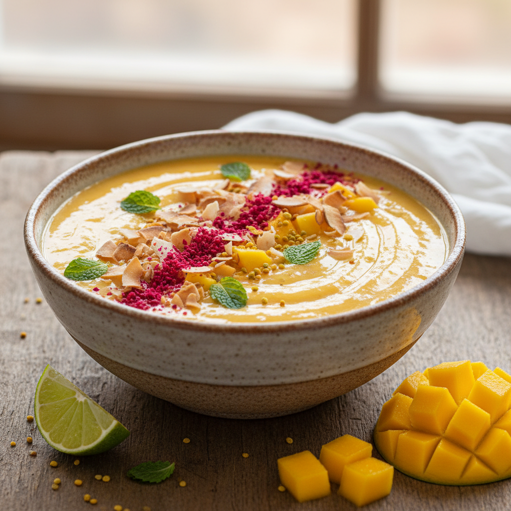 A luxurious, intensely tropical smoothie bowl starring the sweet, aromatic Alphonso mango, enriched by creamy avocado and vibrant coconut milk. Brightened with fresh lime, a warming kiss of ginger, and an exotic whisper of cardamom, finished with contrasting textures of toasted coconut and tart raspberry.