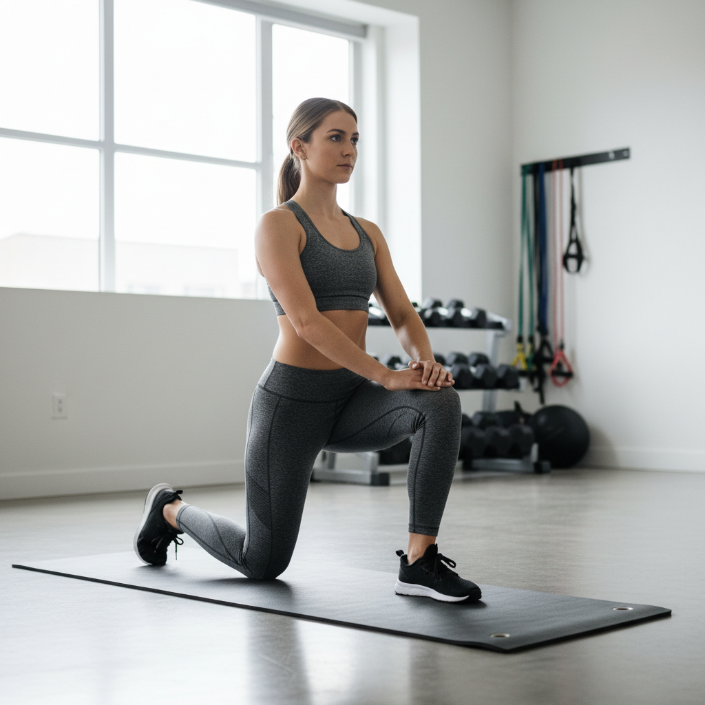 Kneeling Hip Flexor Stretch: Kneel on one knee, with the other foot flat on the floor in front of you. Gently push your hips forward until you feel a stretch in the front of the hip of your kneeling leg. Keep your core engaged to prevent arching your lower back. Hold for 30 seconds, 2-3 repetitions per side.